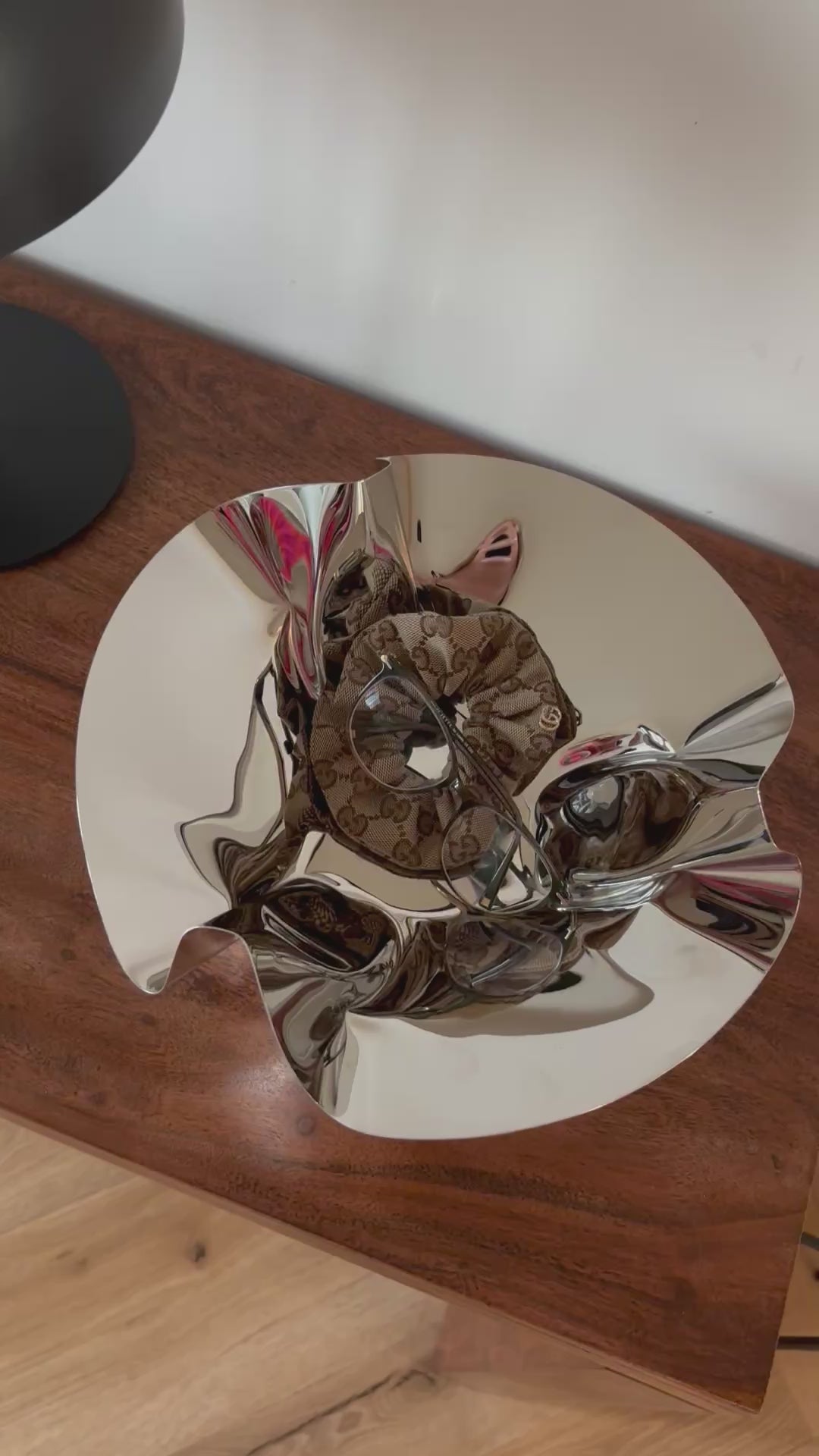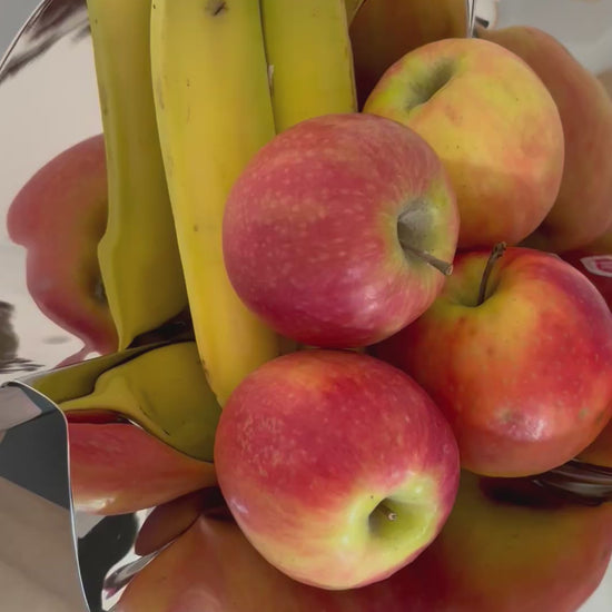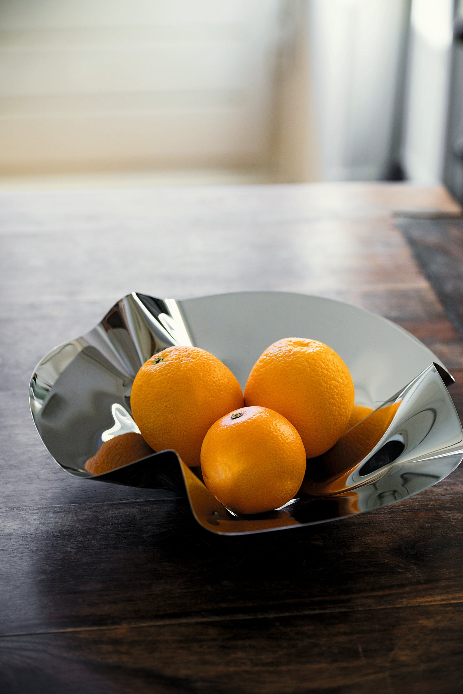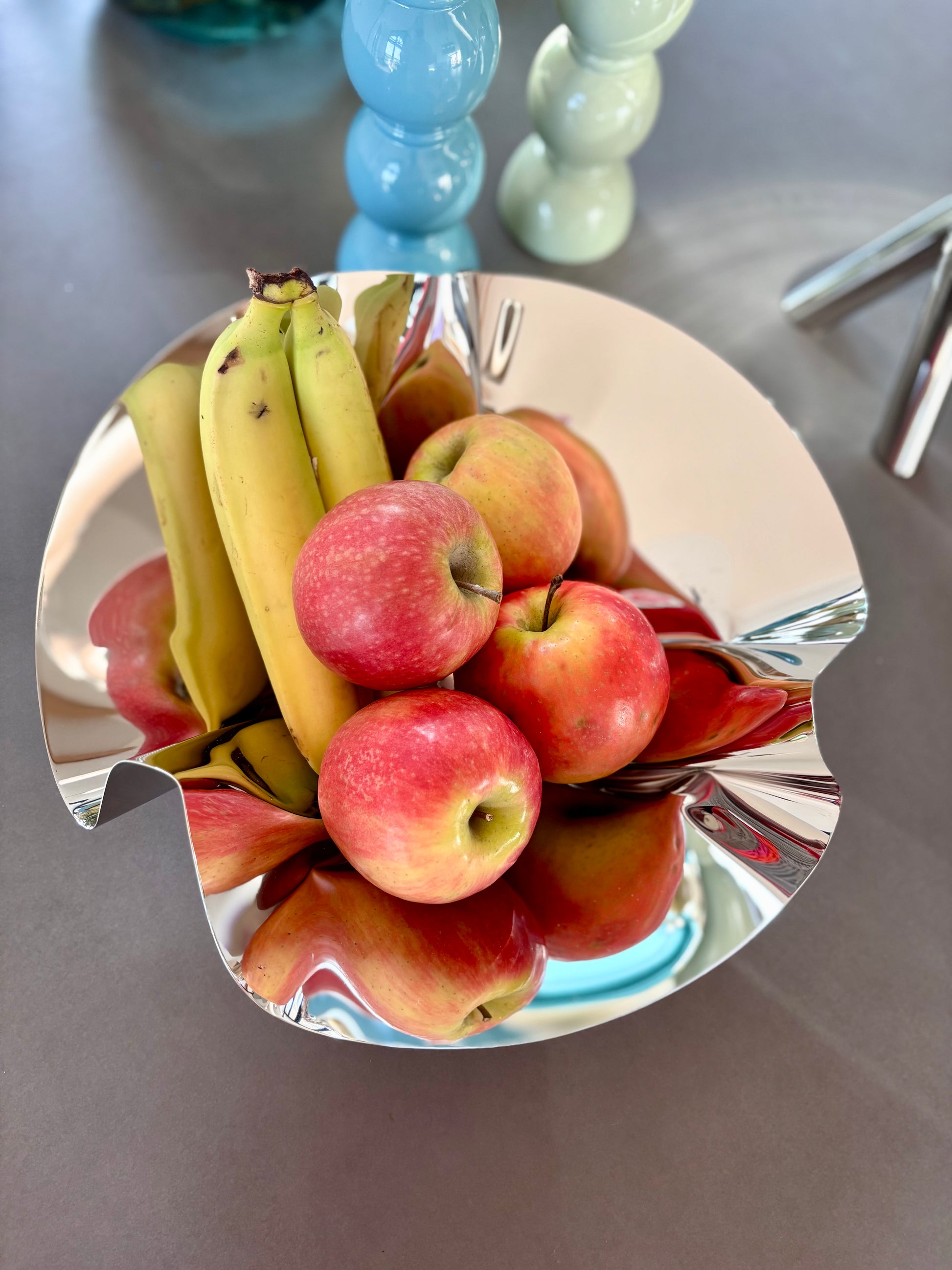 In Falten gelegt und doch an sanfte Meereswellen erinnernd: Die Dekoschale bringt ein Stück maritimes Flair in Ihr Zuhause. Ob Mango, Kiwi, Lychee oder Pitaya – hier treffen sich die Früchte der Welt in einem kunstvoll gefalteten Glanzstück aus hochwertigem, hochglanzpoliertem Edelstahl.