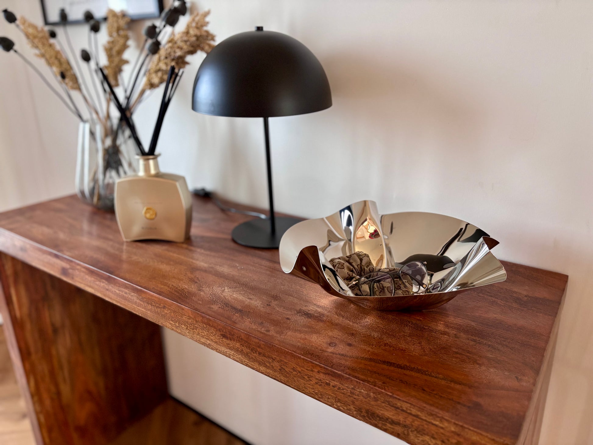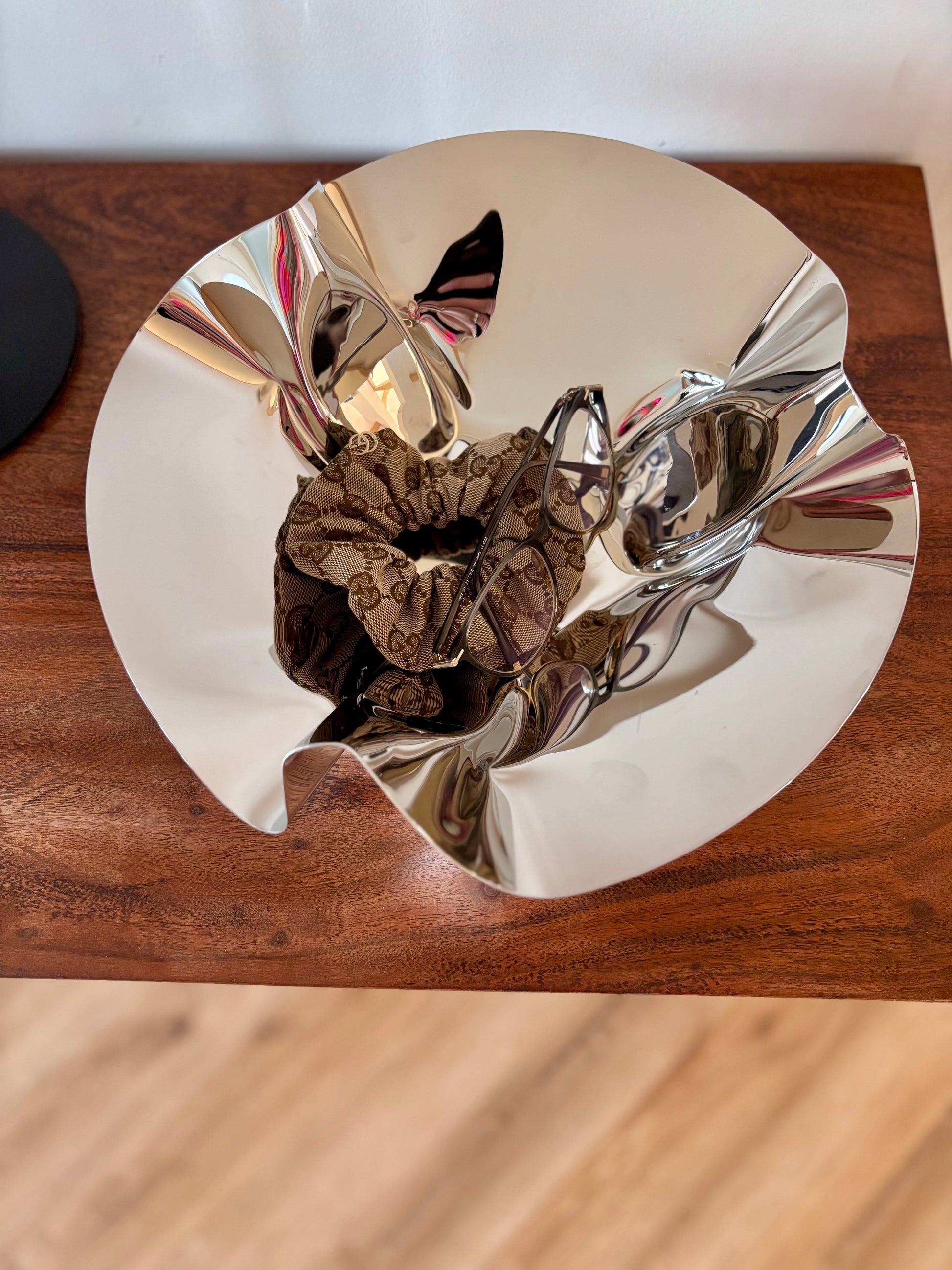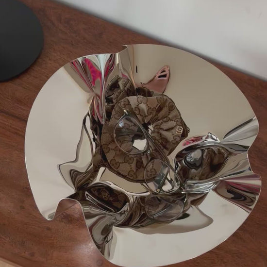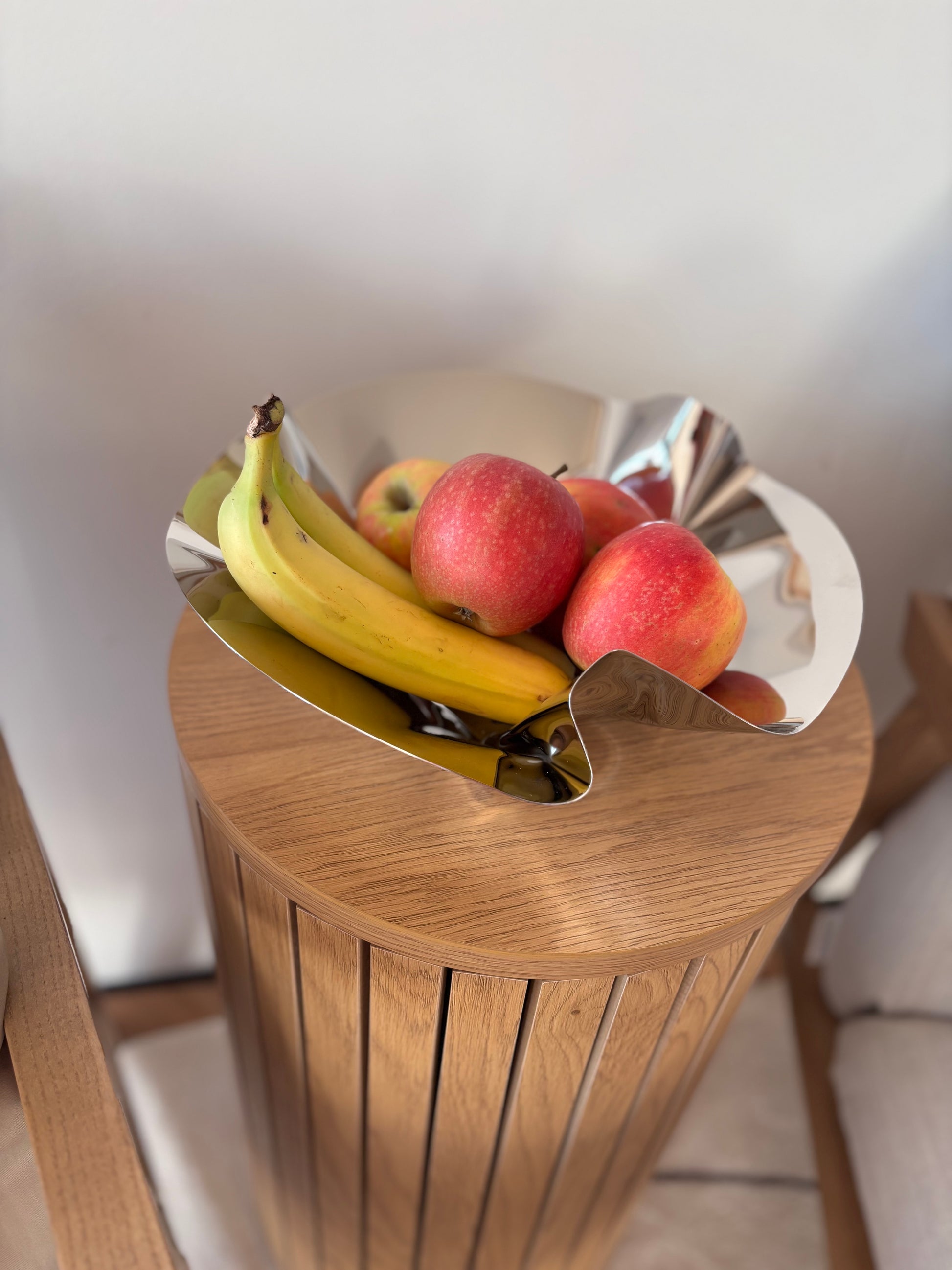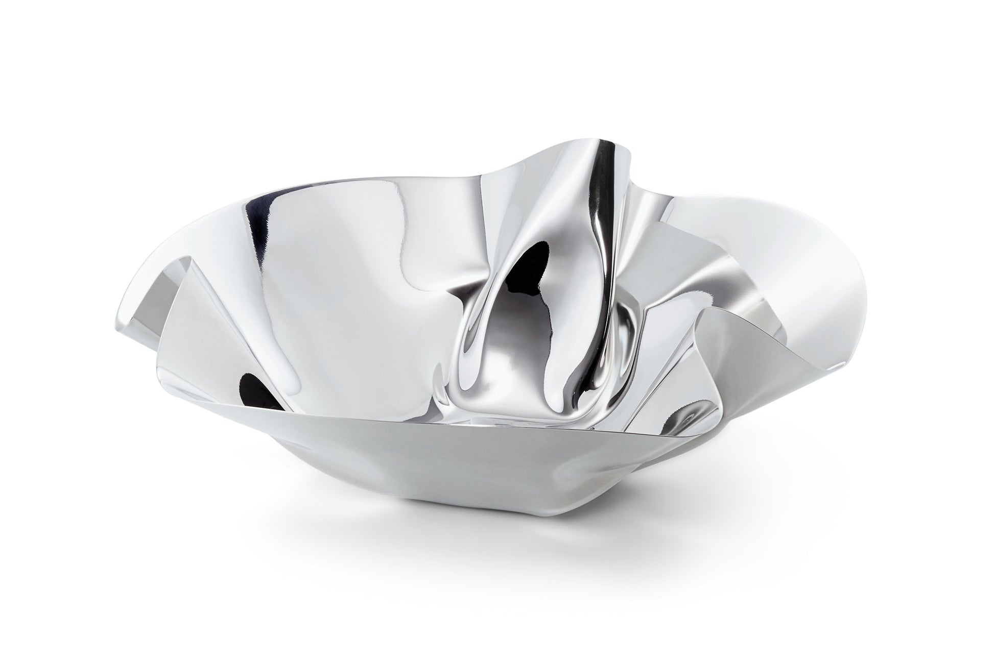 In Falten gelegt und doch an sanfte Meereswellen erinnernd: Die Dekoschale bringt ein Stück maritimes Flair in Ihr Zuhause. Ob Mango, Kiwi, Lychee oder Pitaya – hier treffen sich die Früchte der Welt in einem kunstvoll gefalteten Glanzstück aus hochwertigem, hochglanzpoliertem Edelstahl.